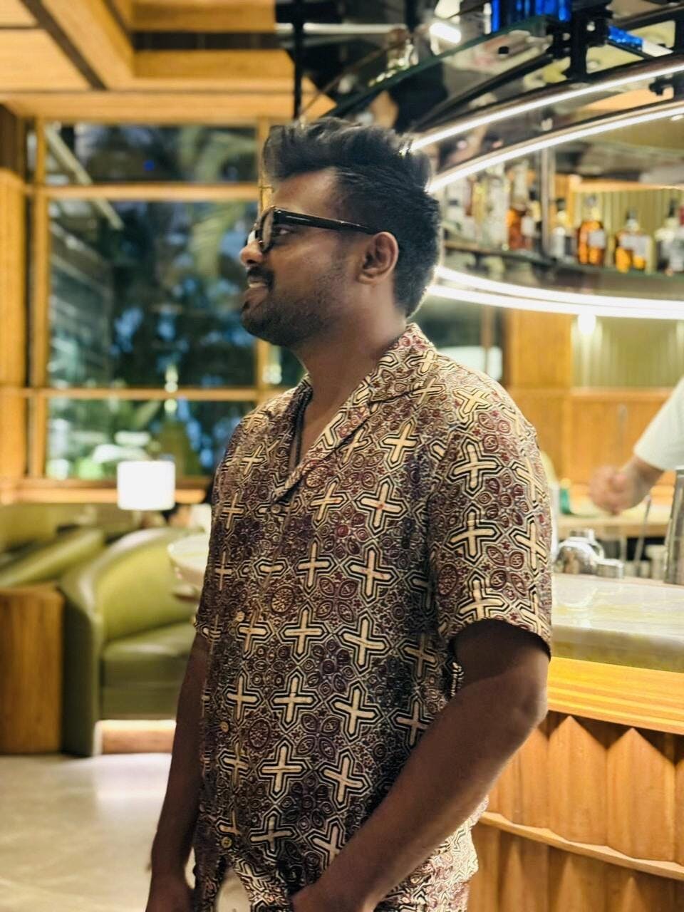 Step up your wardrobe with this vibrant bamboo and modal men's T-shirt, designed with a stylish drop shoulder and Cuban collar neck. Its half sleeves, breathable handloom fabric, and lightweight feel make it perfect for any climate. Featuring wooden buttons with intricate Ajrak prints and a wavy design, this T-shirt combines traditional charm with modern flair. Ideal for parties or casual outings, pair it with cotton pants for a polished and eco-friendly look.